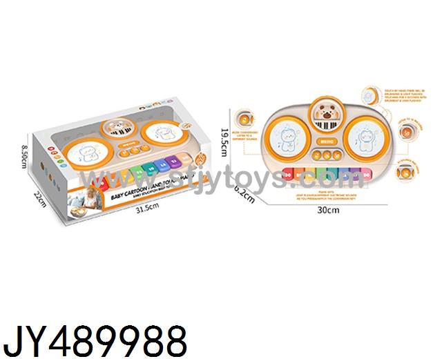 The baby's hand touches the cartoon drum piano